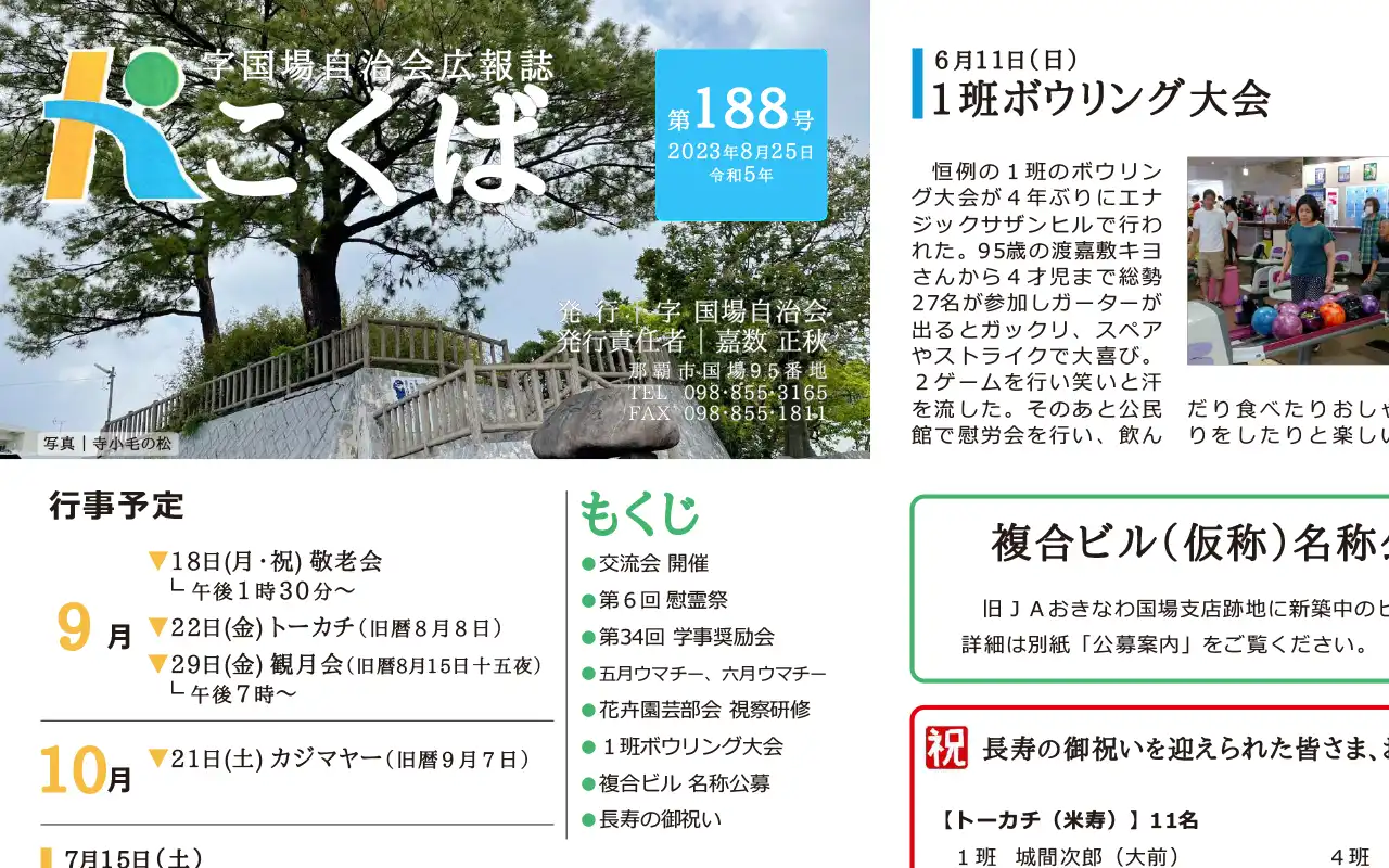字国場自治会では、地域の皆様との情報共有を目的に「広報誌」を定期的に発行しています。 広報誌では、自治会の活動報告や行事のお知らせ、地域に関する最新情報をお届けし、住民の皆様が自治会活動に参加しやすくなるようサポートしています。 また、地域での出来事や歴史、文化に関する特集記事も掲載し、字国場の魅力を再発見していただける内容となっています。